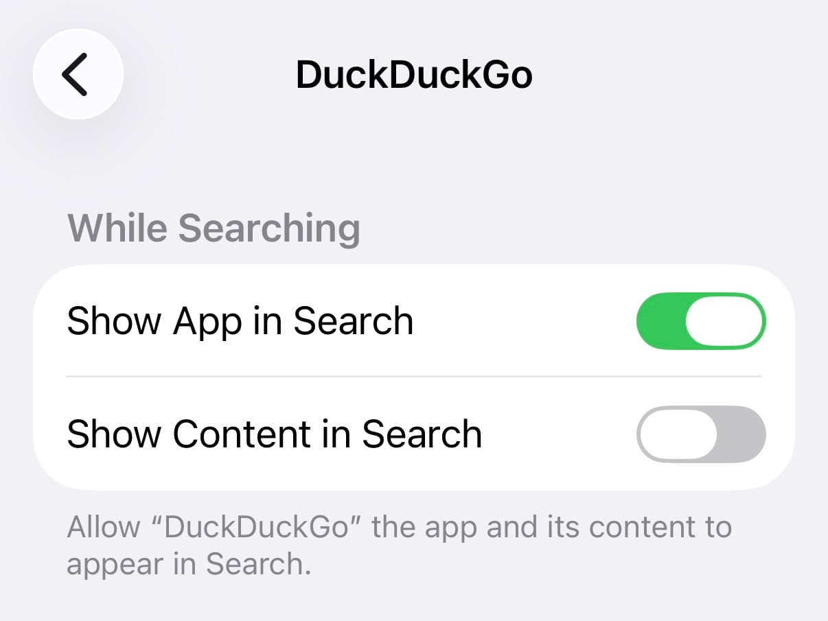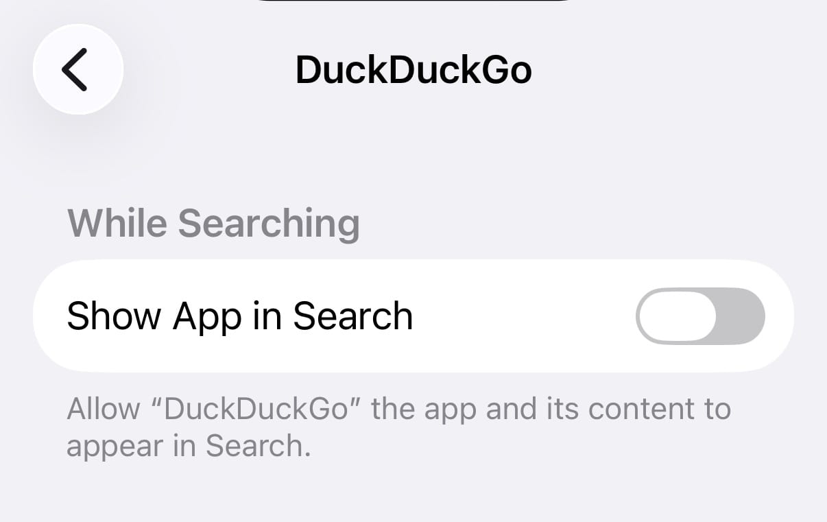 (I’d appreciate an option to scroll through a list of apps that have this setting disabled, and to reset all apps so they show in search. For my Apple friends: FB21172336, Need easier way to see which apps have “Show App in Search” disabled.)