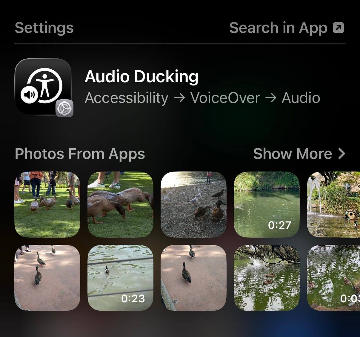A few days ago, I tried using Spotlight search on iOS to open the DuckDuckGo web browser. Normally I swipe down on the Home Screen and type “duck,” but instead of showing the app, it returned a link to the website, Siri Knowledge about the DuckDuckGo company, the Audio Ducking setting, and dozens of photos of ducks I’d forgotten I’d taken.